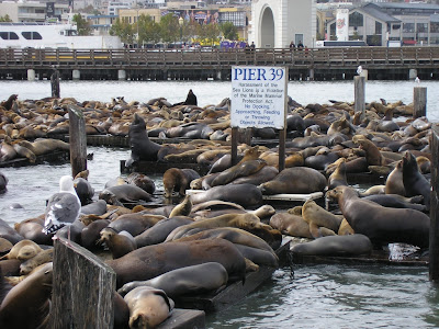Elle, hai ragione, anch'io evito come la peste le zone troppo turistiche, ma per i leoni marini ho fatto un'eccezione, perché, a parte la puzza, sono adorabili. E poi ogni tanto, molto di rado, quando il vento soffia dalla parte giusta, da casa nostra si sente in lontananza il loro schiamazzare, e quindi erano diventati delle creature mitiche che dovevo per forza vedere (un po' come i bisonti del Golden Gate Park, che però non ho ancora visto...).